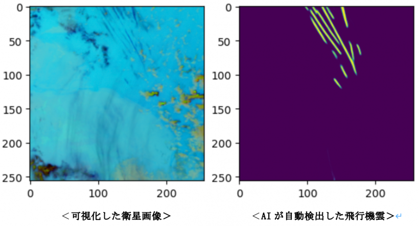 可視化した衛星画像とAIが自動検出した飛行機雲の例を以下に示します。