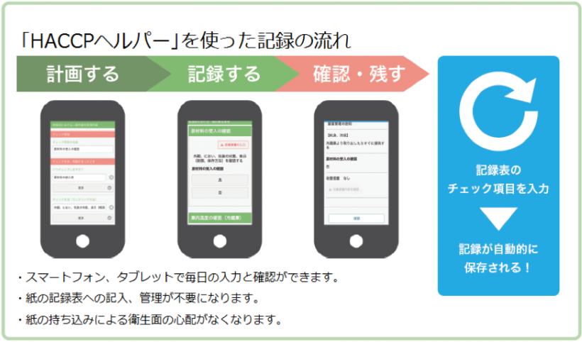 この一連の作業をタブレット、スマートフォンを利用して、手軽で簡単に操作いただくことで衛生管理の取組みの「見える化」の実現を支援します。
