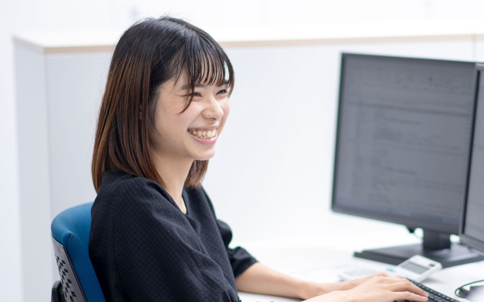 学生時代は心理学を学んでおり、就職活動では事務職に絞って取り組んでいましたが、ある時に職種の選択肢を広げた方が良いと考え、IT系も視野に入れ始めました。もともとパソコンに向かう作業が好きで、プログラミングに興味があったからです。弊社のホームページを初めて見た時、社員インタビューの記事から、働きやすそうで温かそうな社風が伝わってきました。第一印象の良さが、入社の大きな理由です。内定をいただいてからは、IT関連の授業を受けたり、ITパスポートの資格を取得したりして備えました。入社から数年経った今も、入社前に抱いた弊社の印象は変わっていません。社内の雰囲気が安心感につながっています。
