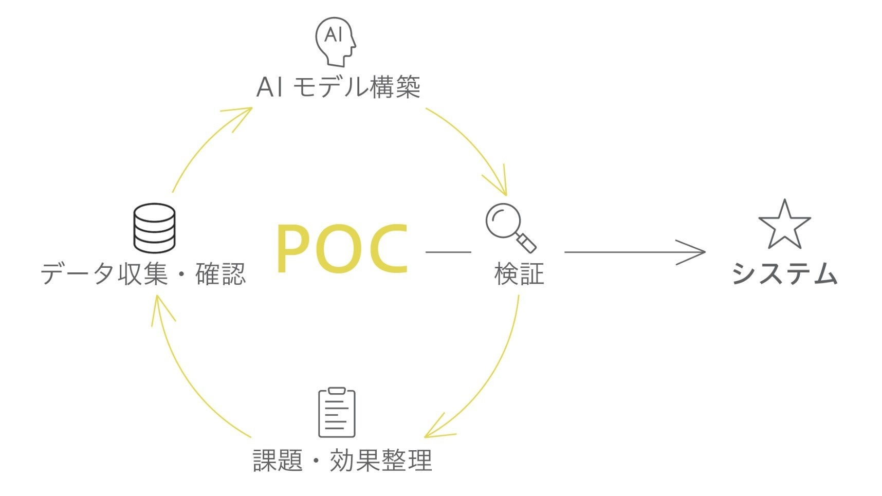 POCでは、実際にAIを導入しようと検討されているデータを用いて、課題を解決するために必要とされるレベルの精度となるか、運用での効果、課題、実現の可能性などを検証します。
