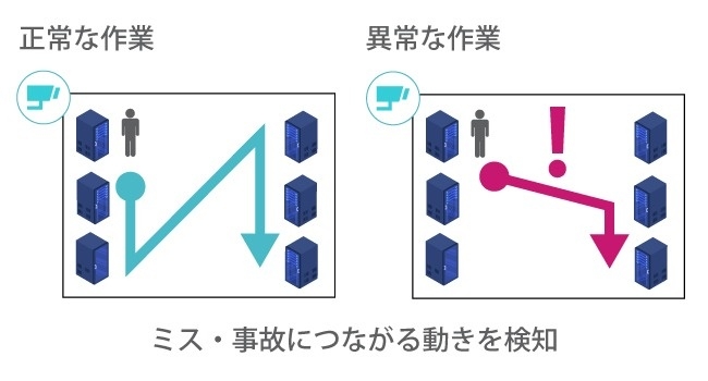 データセンター、製造工場、出荷作業などの業務において、スタッフの行動をカメラ映像、各装置からの信号をもとに分析し、事故・ミスを検知します。