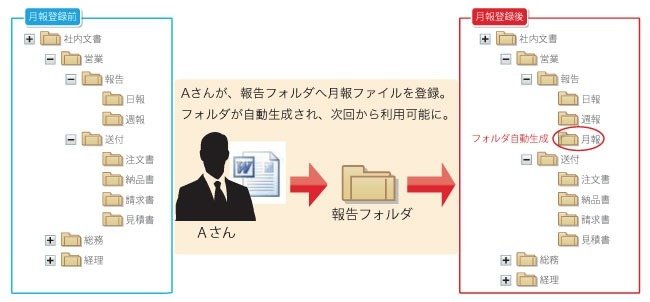 GrowingTree機能は、文書管理システムに蓄積されたドキュメントの属性を解析し、分類用フォルダを自動生成します。