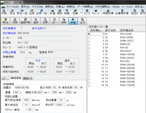 成形機マスタ、金型マスタ、樹脂マスタ、補材マスタ、成形品マスタ、セット品マスタ