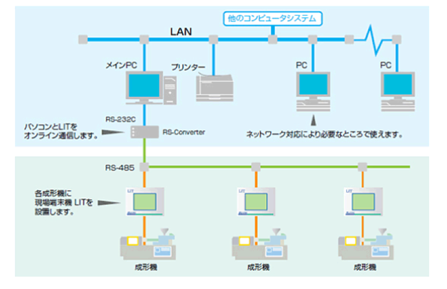 現場端末機LIT(リット)は、タッチパネルコンピュータです。メインパソコンと通信、作業予定を表示したり、成形機の稼働を監視します。